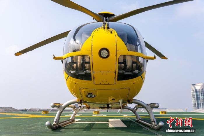 直升机停在杭州高楼上的停机坪。陈韵钊 摄