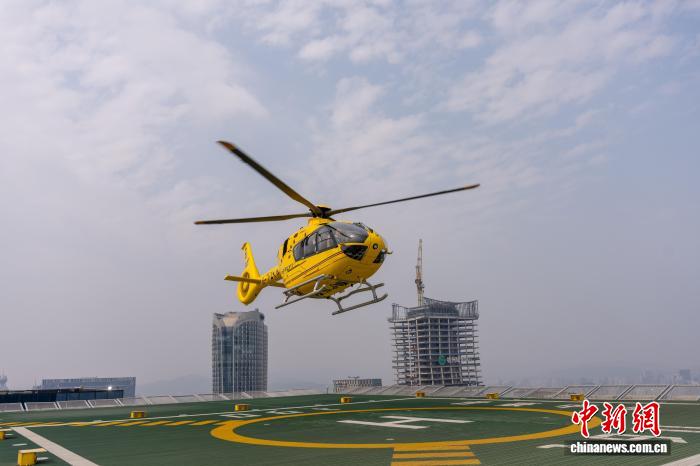 直升机从城市高楼停机坪上起飞。陈韵钊 摄