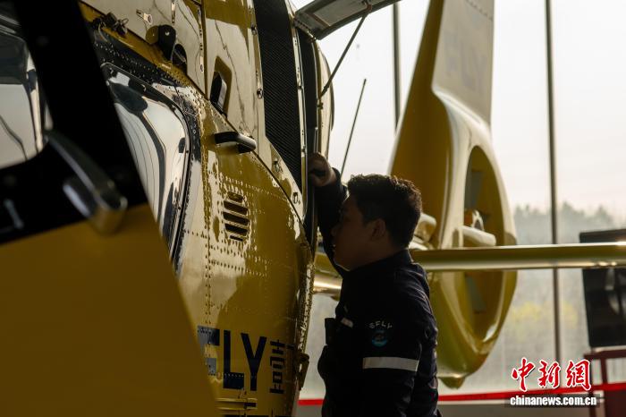 工作人员在起飞前查看直升机设备。陈韵钊 摄